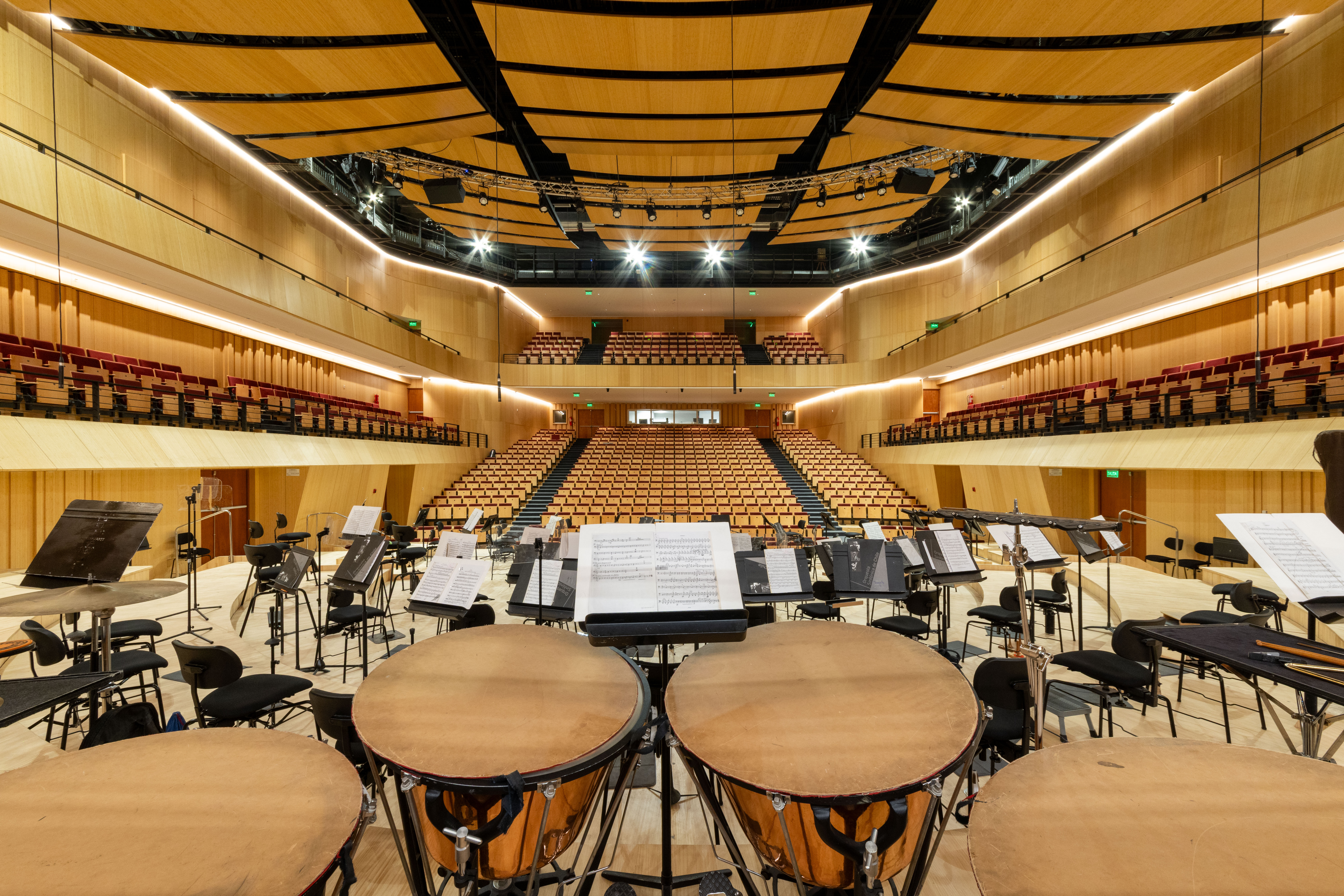 Warm color temperatures emphasize the noble grain of the wood, revealing its texture and depth. Light, cast at grazing angles, caresses the materials, enhancing their natural character and contributing to the acoustic quality of the space. Although the hall does not incorporate an artificial sound control system, its design achieves a perfect balance of visibility, warmth, and reverberation, creating the ideal twilight ambiance for any musical or stage performance.